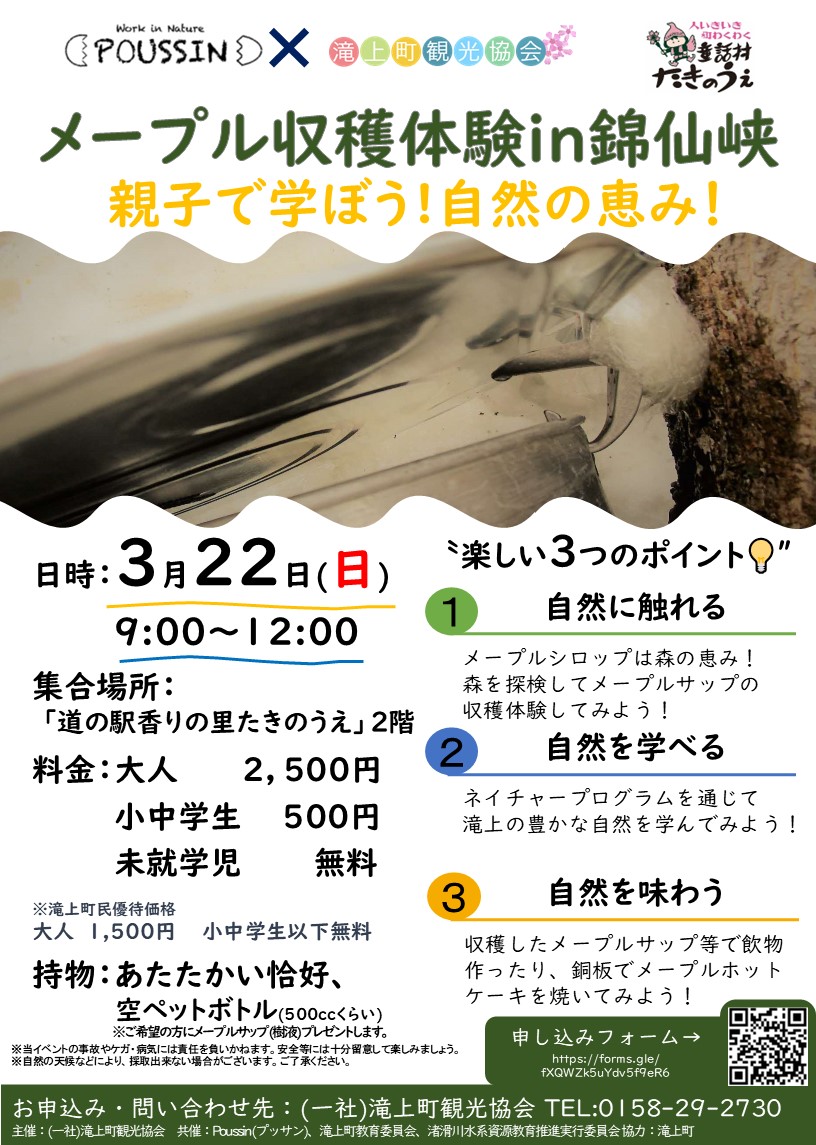 #春の気配を感じる錦仙峡で、一年のうちわずかひと月ほどしか採れないカエデの樹液を味わう「メープル収穫体験ツアー」を今年も開催します。 地元ガイドPoussin(プッサン)の協力のもと、滝上の森を歩きながら、自然の恵みを体感 […]
